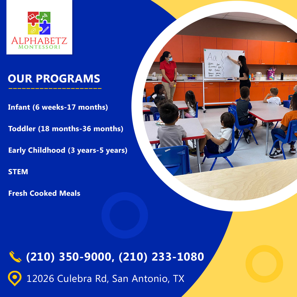 Alphabetz Montessori is the best Montessori in San Antonio TX. You and your child will love our pleasant early learning and childcare center. Our school is located in a secured area. Your child will be cared for in welcoming surroundings balancing closely with your normal daily routine. We have designed all programs to support your child’s all-round development. To know more about the Best daycare in San Antonio Texas please call: (210) 350-9000 https://alphabetzmontessori.com/ :https://www.facebook.com/alphabetzmontessori/?view_public_for=109573684025973