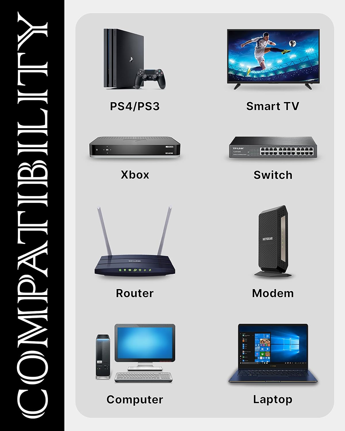 HIGH-PERFORMANCE INTERNET CABLE IS CAT6 RATED – The Ethernet cord with 24 AWG CCA wire provides universal connectivity for LAN network components such as PCs, computer servers, printers, routers, switch boxes, TV, Gaming Devices, network media player...