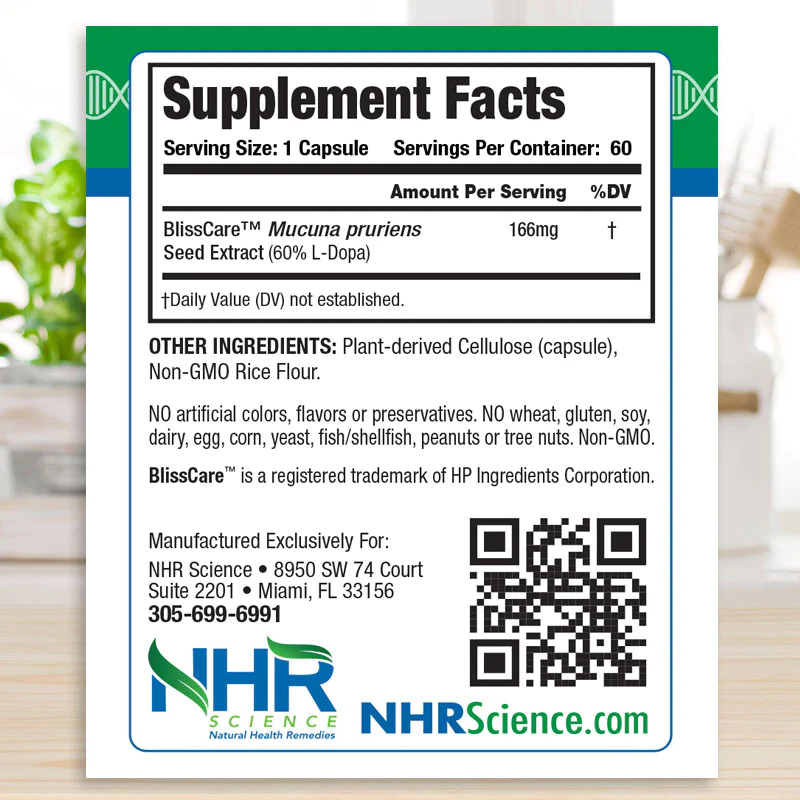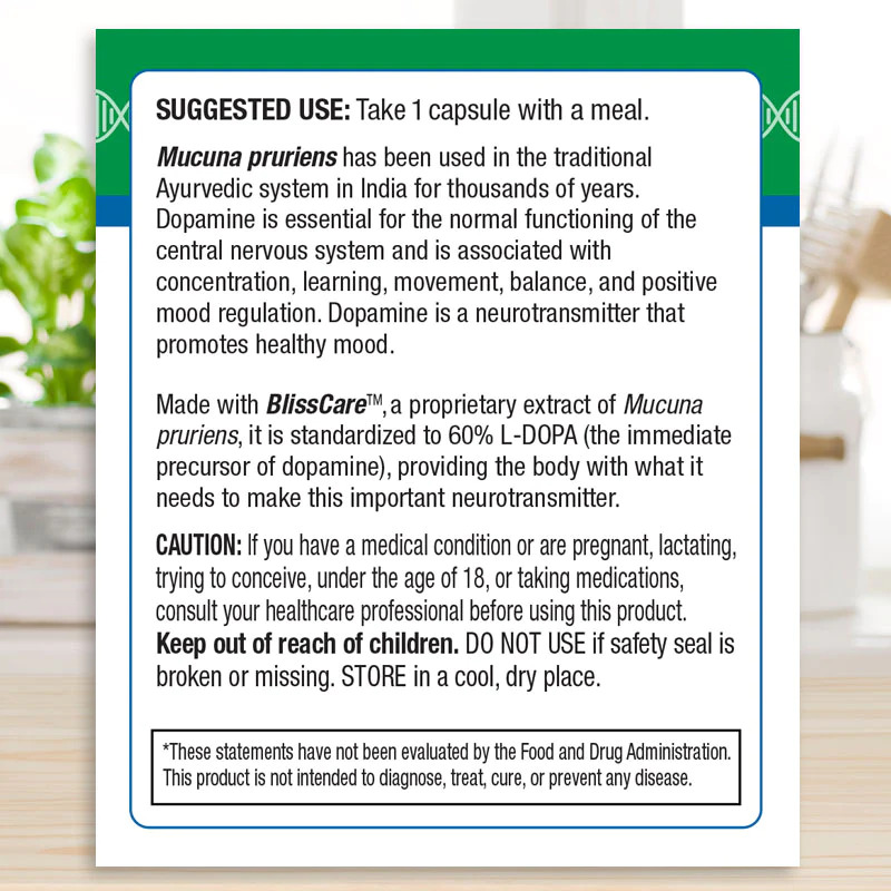 BlissCare™ is standardized to 60% L-DOPA, providing the body with what it needs to make this important neurotransmitter Dopamine.