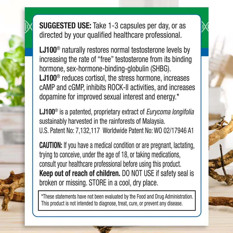 LJ100® is a patented Eurycoma longifolia extract, backed by 16 human clinical studies to naturally restores normal healthy testosterone levels by increasing the rate of “free” testosterone from its binding hormone, ####-hormone-binding-globulin (SHBG). LJ100® is a powerful adaptogen, works by reducing cortisol, the stress hormone, improving physical vitality, stamina and energy.*